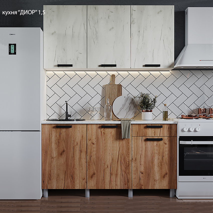 Каталог Кухонная мебель Кухня Диор 1,5 Фото Купить Кухня Диор 1,5 18900 Задать вопрос Заказать по Telegram Стол рабочий с ящиком на 1.50мШкаф навесной на 1.50мЦвет: крафт табак/крафт белый —