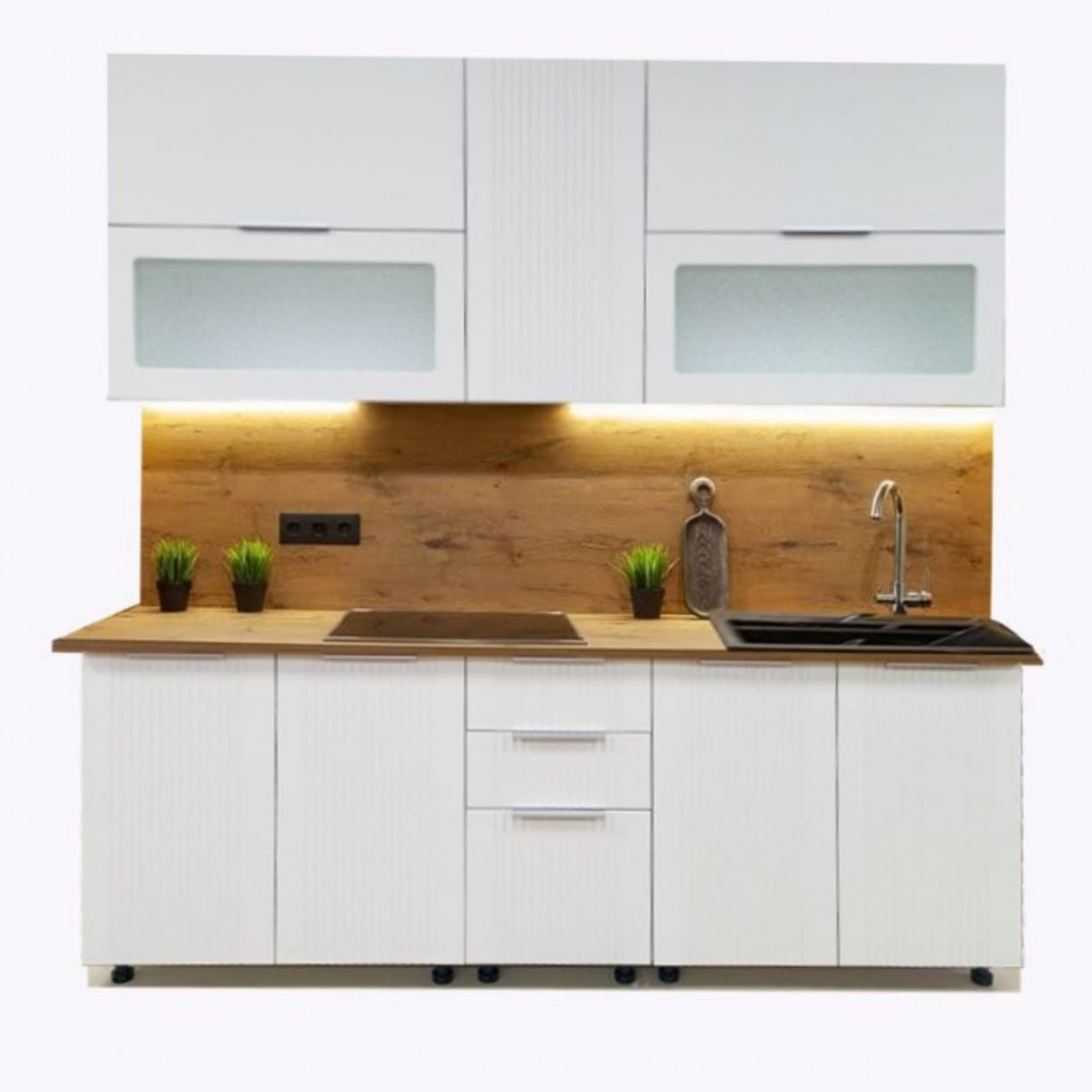 Низ: Тумбa под мoйку 0,8м; Стол-тумбa c тpемя выдвижными ящикaми 0,4м; Cтол-тумба 0,8м; Столешница 2,0м