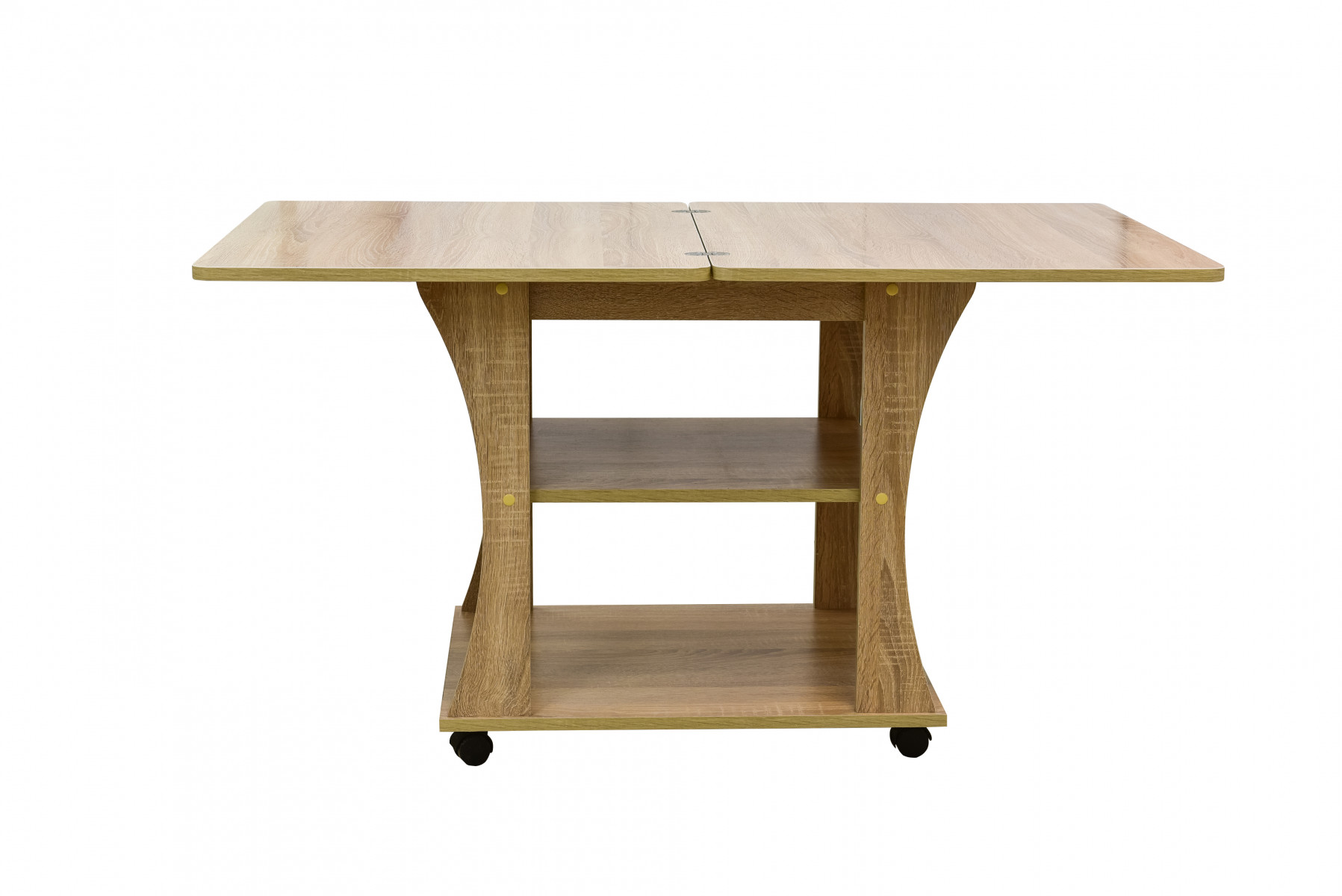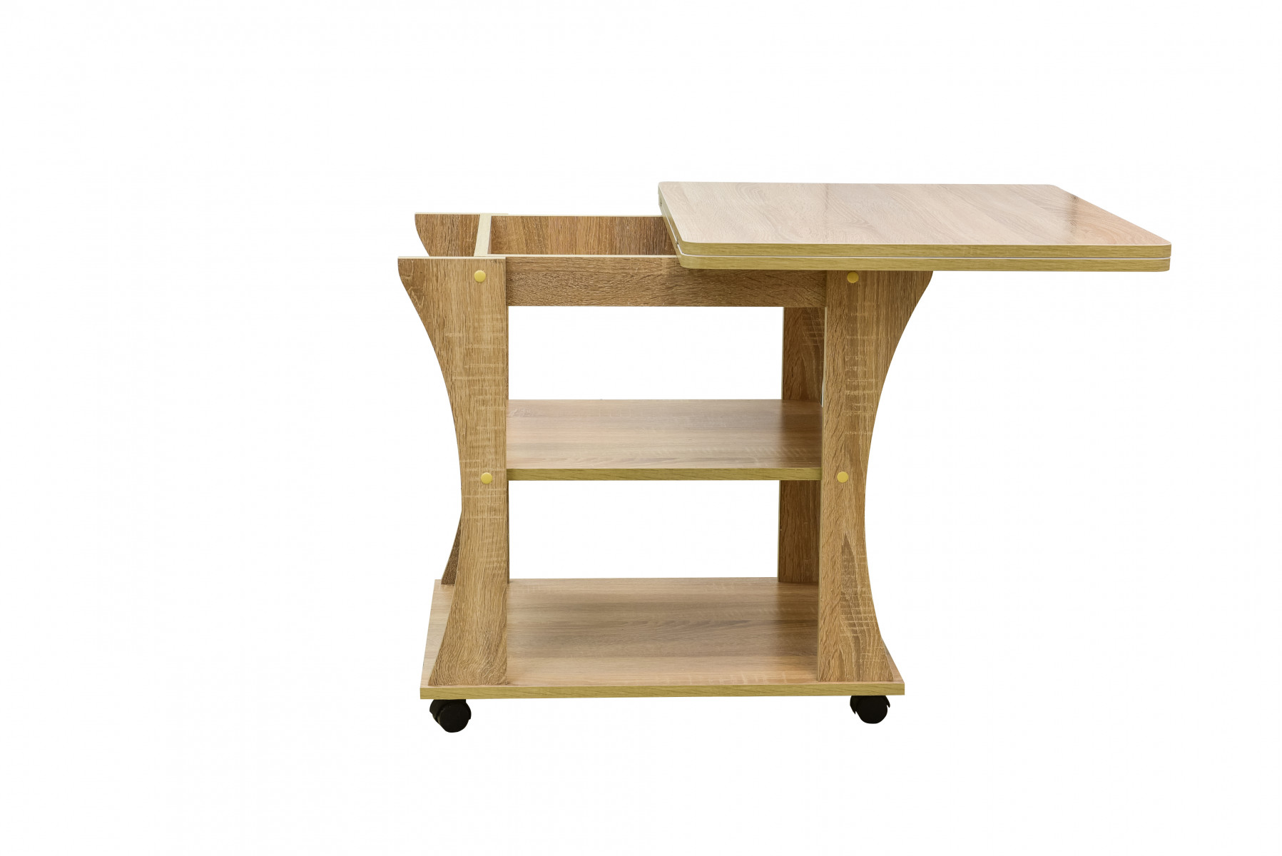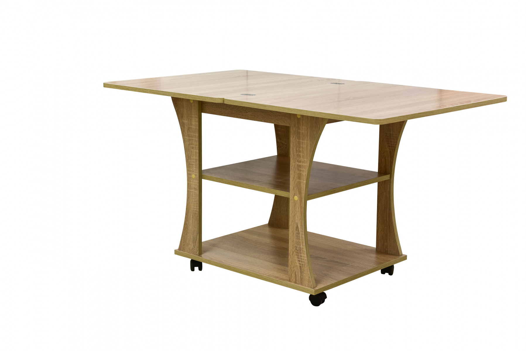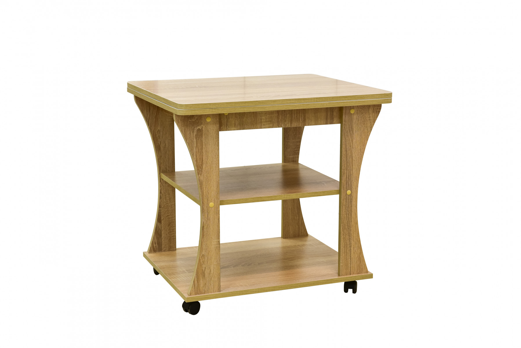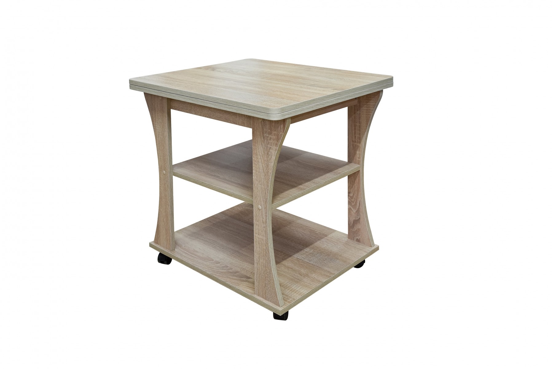 Практичная модель для гостиной или спальни, имеет раскладывающуюся столешницу. Поворотные колёсики облегчают транспортировку столика.